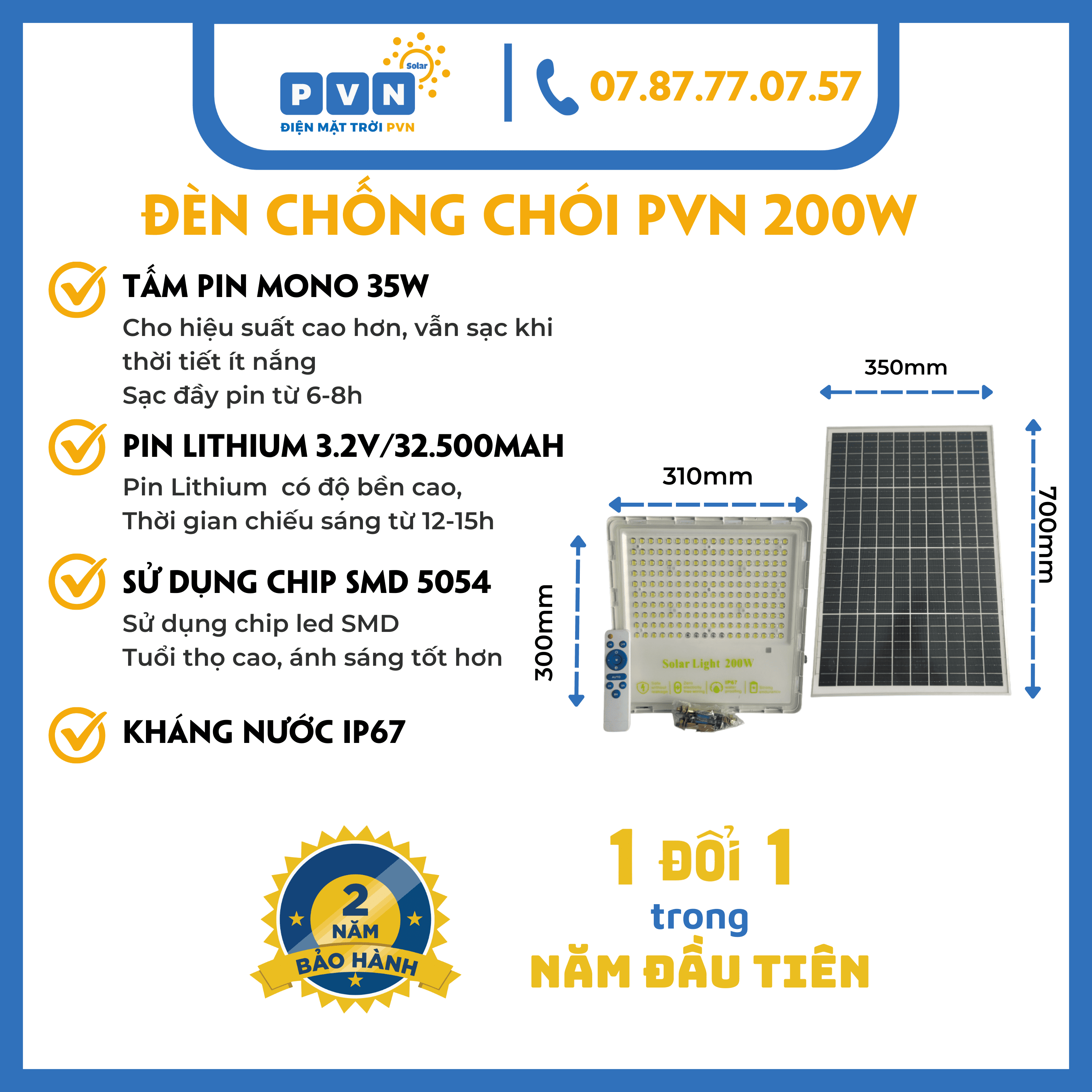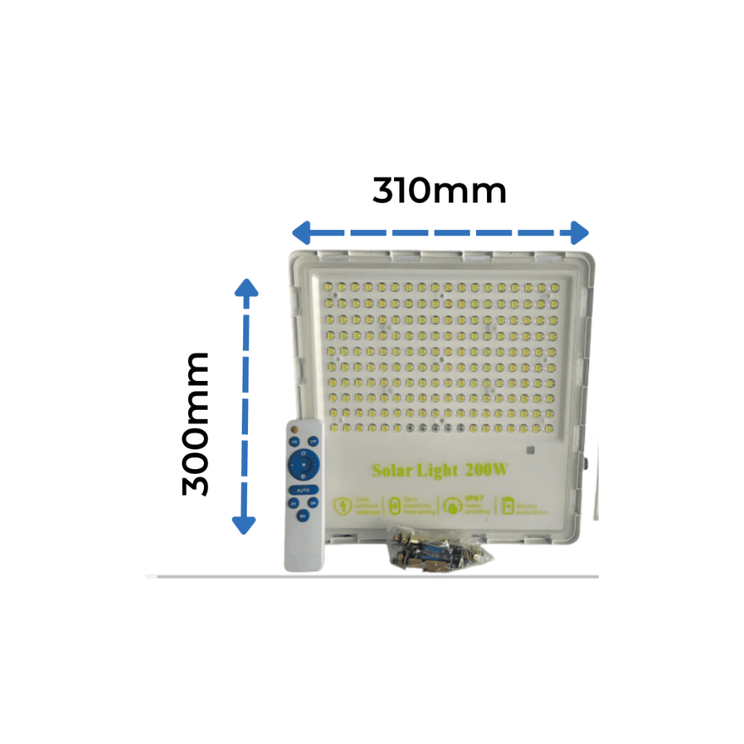 Đèn chống chói năng lượng mặt trời 200W của PVN Solar Light được thiết kế từ nhôm đúc nguyên khối và kính cường lực chất lượng cao, đảm bảo độ bền và tuổi thọ sản phẩm. Có chỉ số chống nước IP67, chịu được các điều kiện thời tiết khắc nghiệt. Kích thước đèn 300x310mm. Đèn dùng chip led SMD, cho ánh sáng mạnh và rõ.