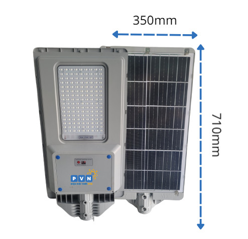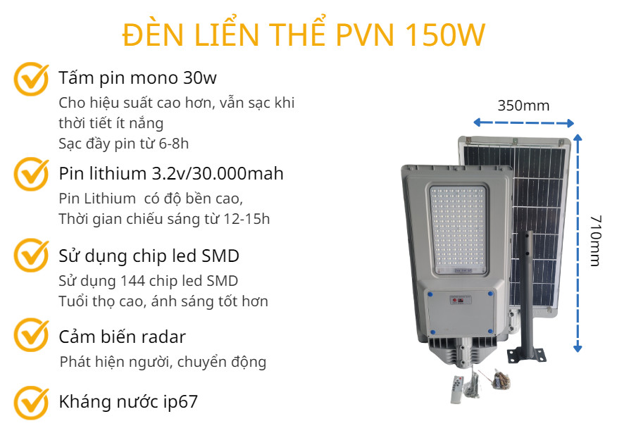 Đèn đường liền thể năng lượng mặt trời PVN 150W có công suất 150W, sử dụng 144 chip LED SMD siêu sáng và tiết kiệm điện. Tấm pin năng lượng mặt trời có công suất 30W, có khả năng chuyển hóa ánh sáng mặt trời thành điện năng hiệu quả. Pin tích điện có dung lượng 30.000mAh, có thể cung cấp điện cho đèn chiếu sáng từ 12-15 giờ liên tục. Đèn còn được trang bị chế độ cảm biến radar và điều khiển ánh sáng thông minh, giúp cho đèn tự động bật/tắt theo ánh sáng tự nhiên và phát sáng mạnh khi có người di chuyển gần đèn.