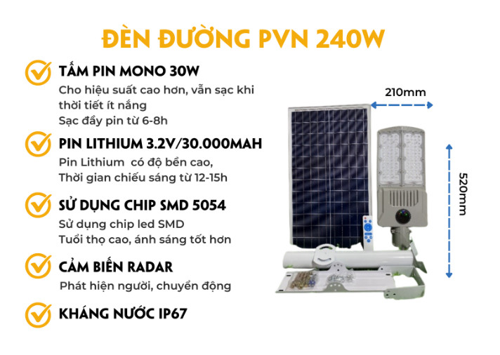 Đèn đường năng lượng mặt trời PVN 240w(PVN240P2): là một loại đèn năng lượng mặt trời có công suất 240W và dung lượng pin 30.000mAh. Đây là một loại pin lớn và chất lượng cao, có thể sạc nhanh và duy trì thời gian chiếu sáng lâu dài. Theo nhà sản xuất, PVN240P2 có thể chiếu sáng từ 12 đến 15 giờ sau khi sạc đầy trong khoảng 6 đến 8 giờ. Điều này giúp bạn không phải lo lắng về việc cắt điện hay thiếu ánh sáng vào ban đêm.