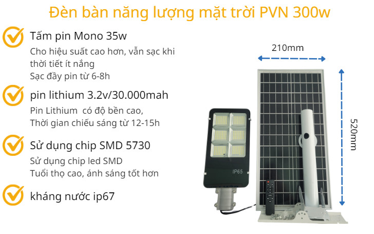Với những ưu điểm trên, đèn đường năng lượng mặt trời PVN 300W là một sản phẩm đáng để bạn lựa chọn khi cần một giải pháp chiếu sáng tiết kiệm và bền bỉ.