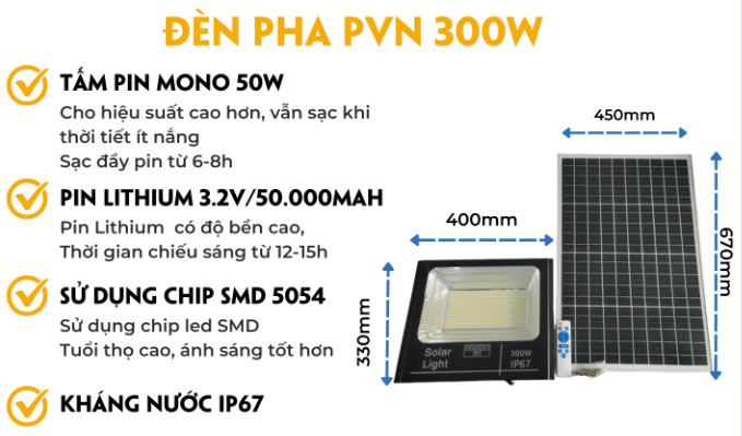 Đèn pha năng lượng mặt trời PVN 300W: là một loại đèn năng lượng mặt trời có công suất 300W và dung lượng pin lithium 50.000mAh. Đây là một loại pin lithium chất lượng cao, tuổi thọ pin lên có thể sạc nhanh và duy trì thời gian chiếu sáng lâu dài. Theo nhà sản xuất, đèn có thể chiếu sáng từ 12 đến 20 giờ sau khi sạc đầy trong khoảng 6 đến 8 giờ. Điều này giúp bạn không phải lo lắng về việc cắt điện hay thiếu ánh sáng vào ban đêm.