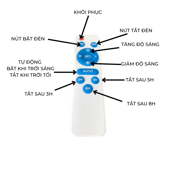 Điều khiển đèn bằng remote từ khoảng cách 10m. Bạn có thể tắt mở, tăng giảm độ sáng, hẹn giờ cho đèn một cách dễ dàng và tiện lợi. Bạn cũng có thể chọn chế độ Auto để đèn tự động bật khi trời tối và tắt khi trời sáng. Ngoài ra, bạn cũng có thể khôi phục cài đặt gốc cho đèn nếu muốn.