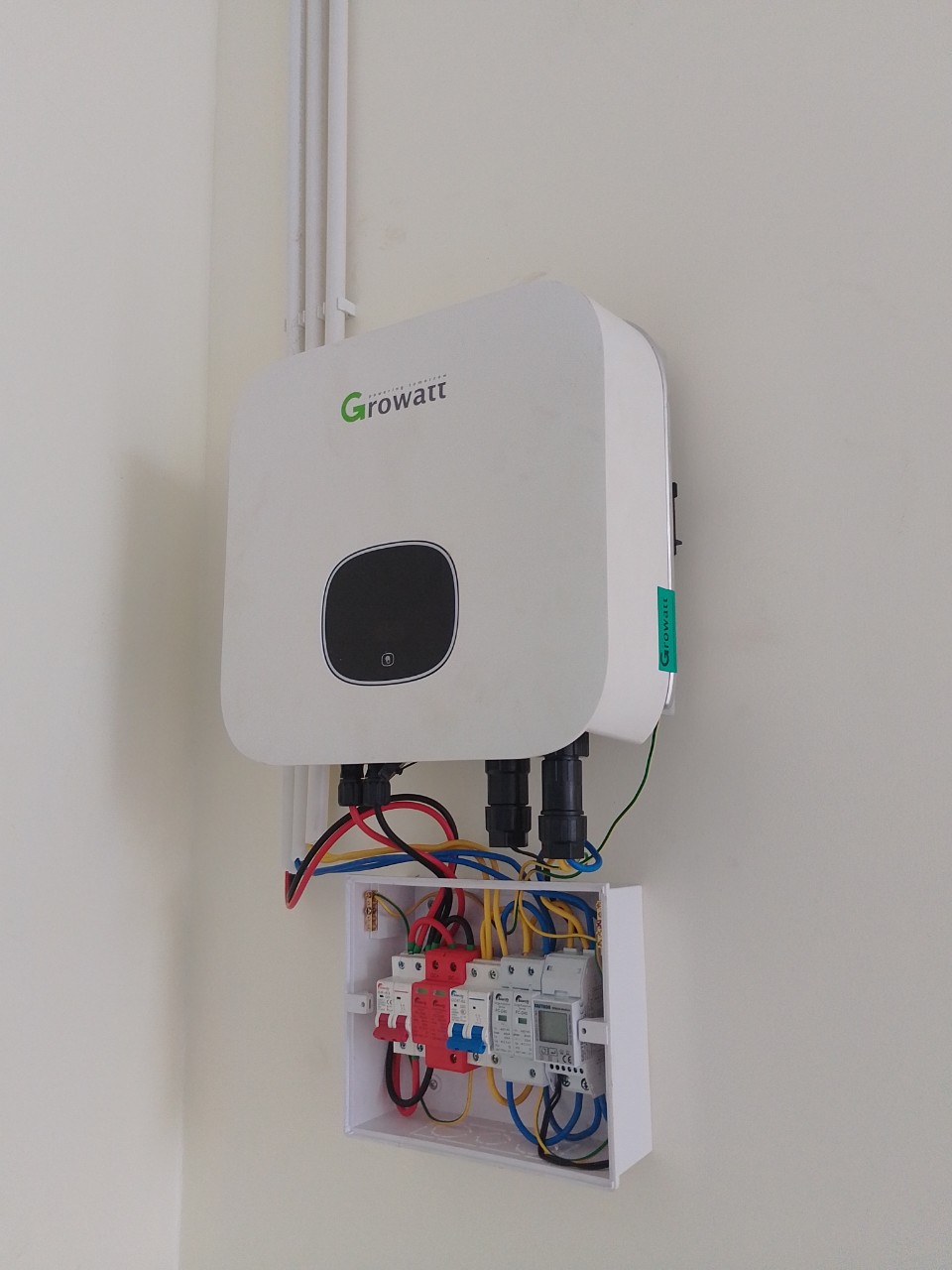 - Inverter Growatt 5kw, là thiết bị chuyển đổi dòng điện xoay chiều từ tấm pin sang dòng điện xoay chiều 220V để sử dụng cho các thiết bị điện trong nhà.