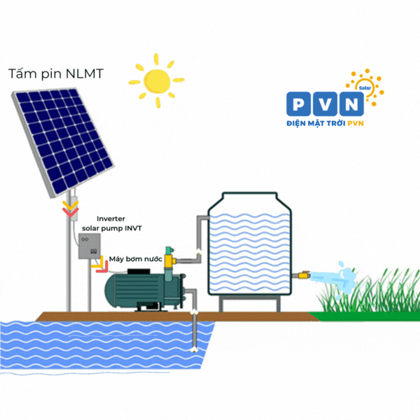 - Máy bơm sẽ được cấp điện AC từ inverter để vận hành và bơm nước từ nguồn ngầm lên bề mặt.