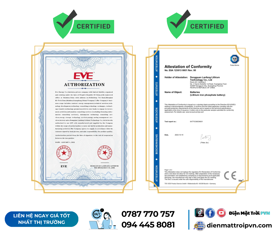 - Sử dụng Cell EVE loại A++ mới 100%, có chứng nhận từ nhà máy EVE, đảm bảo chất lượng và hiệu suất tối đa.