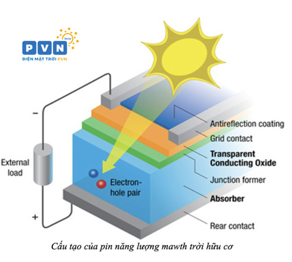 Cấu trúc pin mặt trời hữu cơ: Nhìn chung, pin mặt trời hữu cơ có cấu trúc khá giống với pin mặt trời silicon tinh thể. Chúng chỉ khác nhau ở lớp bán dẫn. Đối với pin mặt trời truyền thống, lớp bán dẫn được làm từ chất bán dẫn silicon. Còn với pin mặt trời hữu cơ, chất bán dẫn là các hợp chất cacbon. Hợp chất này thường được hòa tan trong Solar Ink (một dung dịch thường dùng trong sản xuất pin mặt trời) và được phun trên nhựa mỏng. Nhờ đó mà các tấm pin mặt trời hữu cơ có thể tích hợp vào nhiều vị trí khác nhau hơn so với các tấm pin đơn tinh thể hay đa tinh thể.