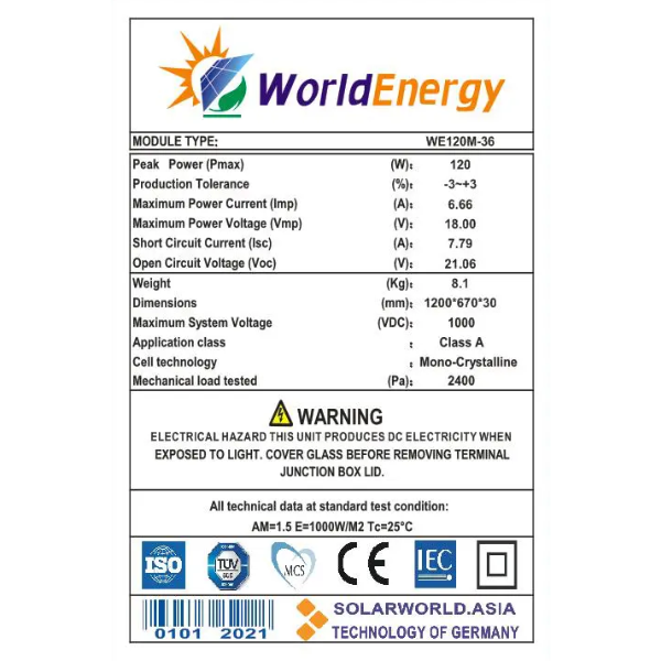 TẤM PIN MẶT TRỜI MONOCRYSTALLINE WE120W là hệ thống chuyển đổi năng lượng mặt trời thành dòng điện phục vụ nhu cầu sinh hoạt thiết yếu cho mỗi người dân ở vùng sâu vùng xa chưa có mạng lưới điện quốc gia rất thuận tiện với những hộ gia đình mong muốn giảm thiểu chi phí tiền điện. Tấm pin năng lượng mặt trời MONOCRYSTALLINE WE120W sẽ giúp bạn tiết kiệm tối đa chi phí hàng tháng của bạn.