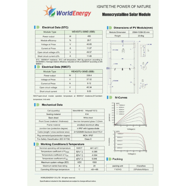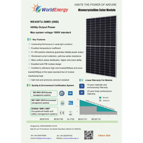 TẤM PIN MẶT TRỜI MONOCRYSTALLINE W450W là hệ thống chuyển đổi năng lượng mặt trời thành dòng điện phục vụ nhu cầu sinh hoạt thiết yếu cho mỗi người dân ở vùng sâu vùng xa chưa có mạng lưới điện quốc gia rất thuận tiện với những hộ gia đình mong muốn giảm thiểu chi phí tiền điện. Tấm pin năng lượng mặt trời MONOCRYSTALLINE WE450W sẽ giúp bạn tiết kiệm tối đa chi phí hàng tháng của bạn.